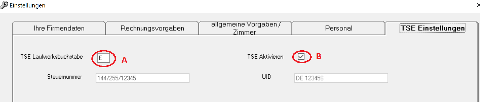 A den Laufwerksbuchstaben des TSE USB-Sticks eingeben B Hacken unter TSE Aktivieren setzen, es müssen UID und Steuernummer gesetzt sein, diese können im Reiter Ihre Firmendaten geändert werden. Sollten Sie keine UID haben kann auch ein "-" eingegeben werden 6. Hotel 5.0 neustarten 7. Wenn jetzt eine Neue Rechnung erstellt wird sehen sie die Signaturdaten auf der Rechnung